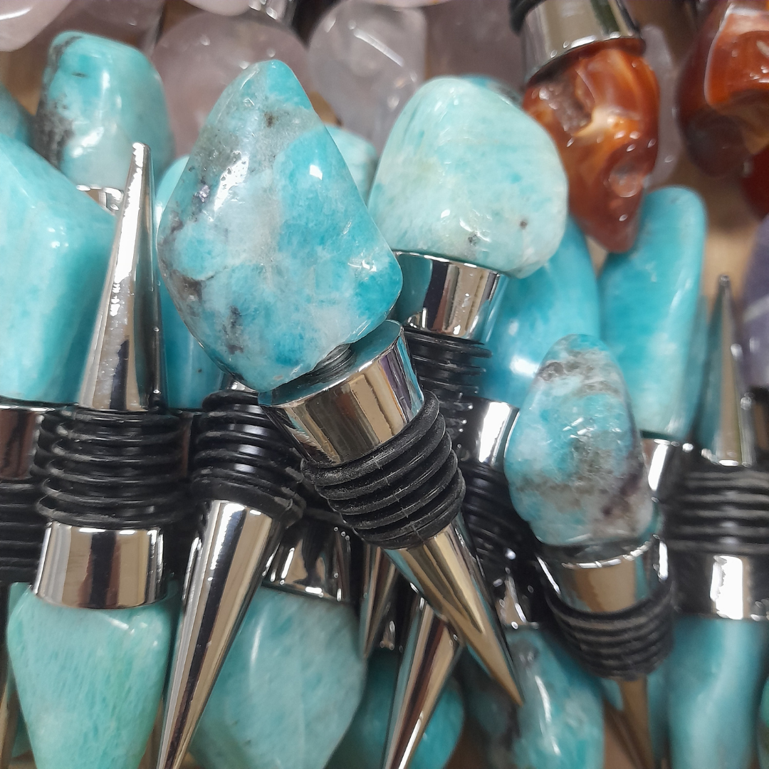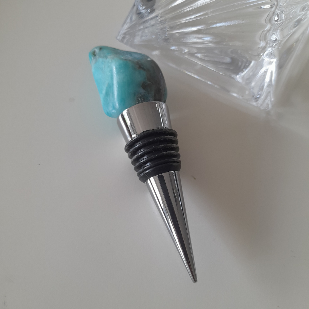 Unieke wijnstopper met amazoniet – een steen die bekendstaat om zijn kalme uitstraling. De combinatie met roestvrij staal geeft dit item een exclusieve, moderne look. Een echte eyecatcher in elk cadeau- of interieurassortiment.