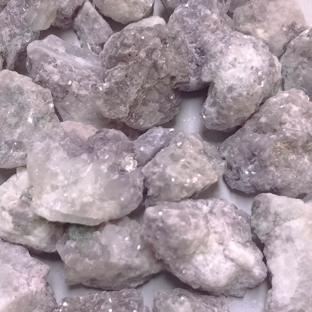 Ruwe lepidoliet in kwarts van A kwaliteit uit Brazilië. De stukjes wegen gemiddeld 25 tot 50 gram per stuk. Het totaalgewicht is circa 500 gram per bestelling, waarbij wij een zorgvuldig samengestelde selectie aan stukken leveren (weeggewicht). Perfect voor verkoop per stuk, sieraden of decoratie.