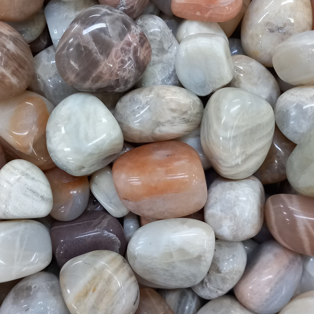 Maansteen trommelstenen gemaakt van A kwaliteit materiaal in diverse kleuren afkomstig uit India. De meeste stenen een mooie flash. Ze zijn ca. 2,5 tot 3,5 cm. groot.