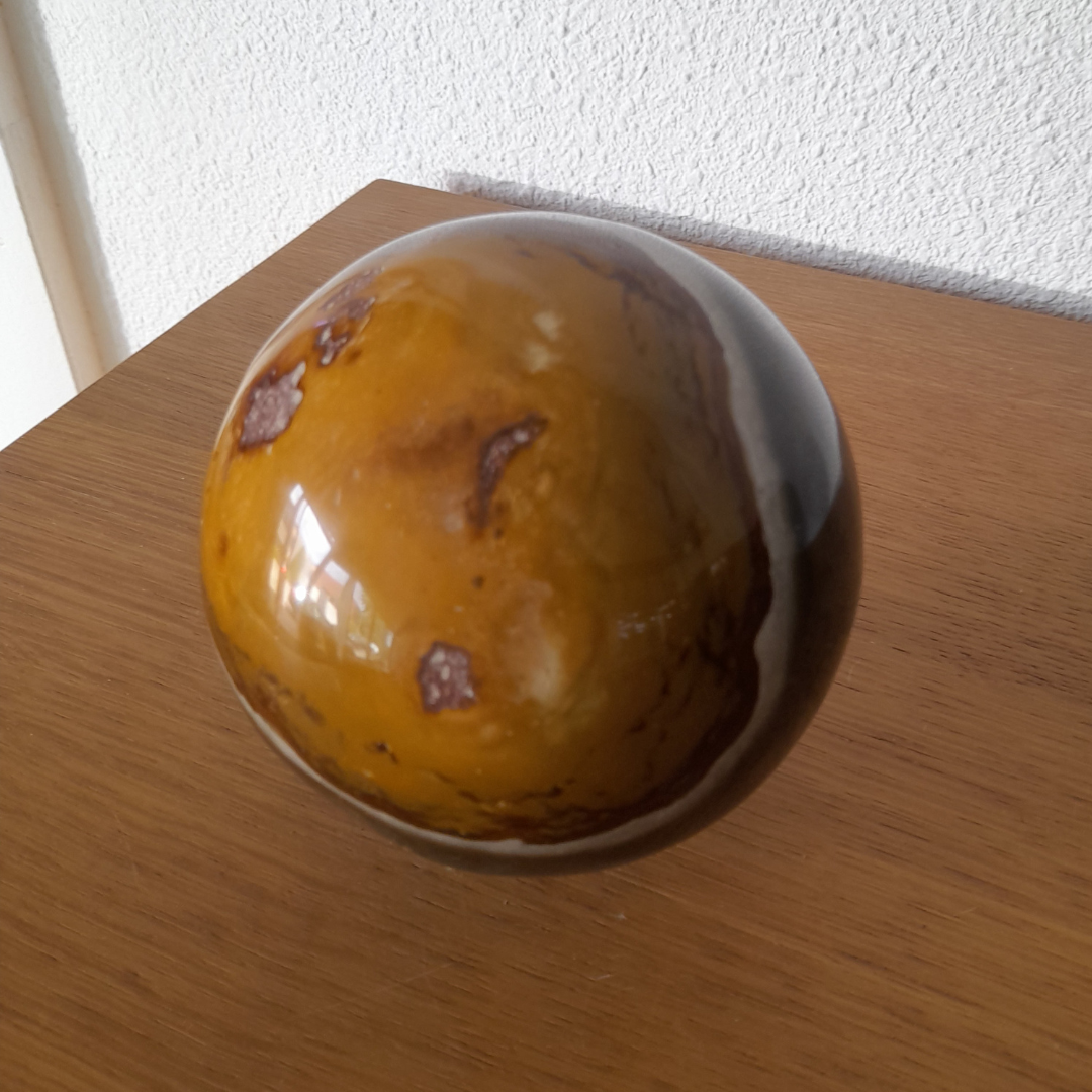 Bol van A-kwaliteit polychroom jaspis met warme, aardse kleurschakeringen. Gemaakt van massieve steen uit Madagaskar. Elke bol is een natuurlijke eyecatcher met karakter.