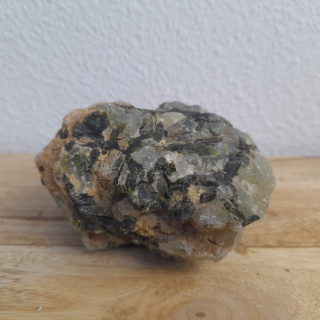Deze ruwe prehniet uit India heeft een lichte, groene kleur, met donkergroene epidot-insluitsels die voor een uniek contrast zorgen. De combinatie van de heldere prehniet en de intensere groene epidot maakt elk stuk bijzonder.
