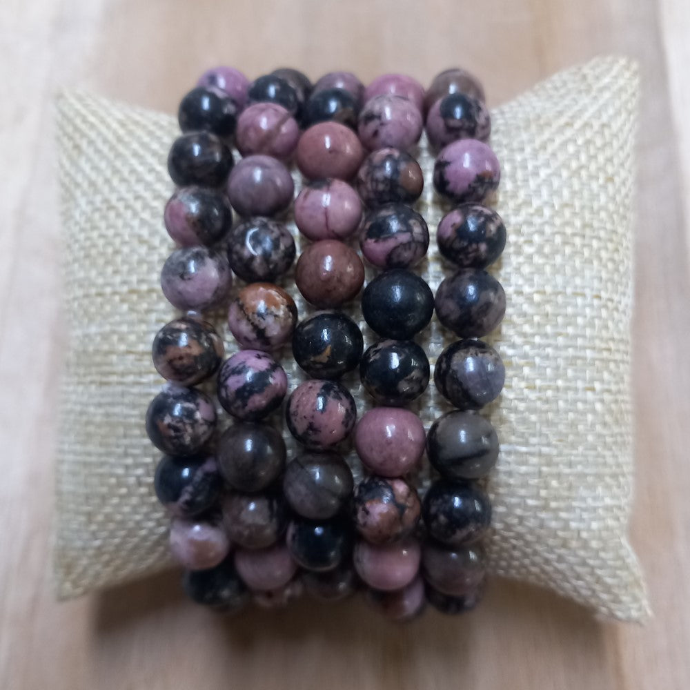Deze armband is gemaakt van natuurlijke rhodoniet kralen van 8 mm.