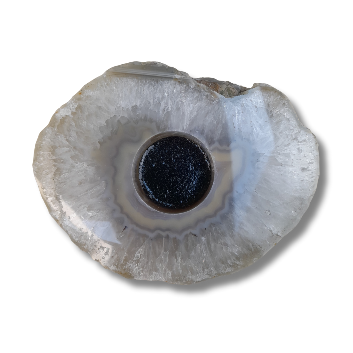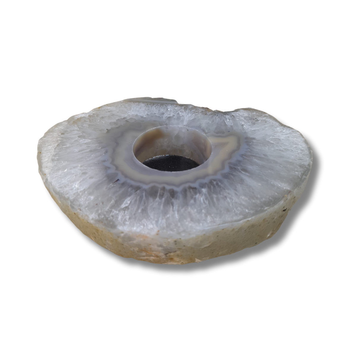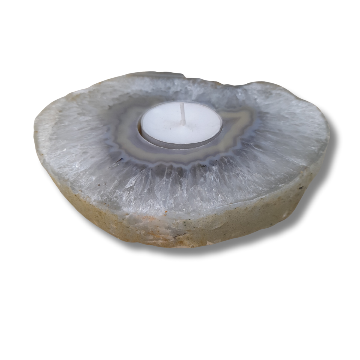 Luxe agaat theelicht met handgeslepen randen en een prachtig glanzend gepolijste kristalstructuur aan de binnenzijde. De diepe uitsparing laat het waxinelichtje mooi verzonken liggen, waardoor het geheel een elegante, rustige uitstraling krijgt.