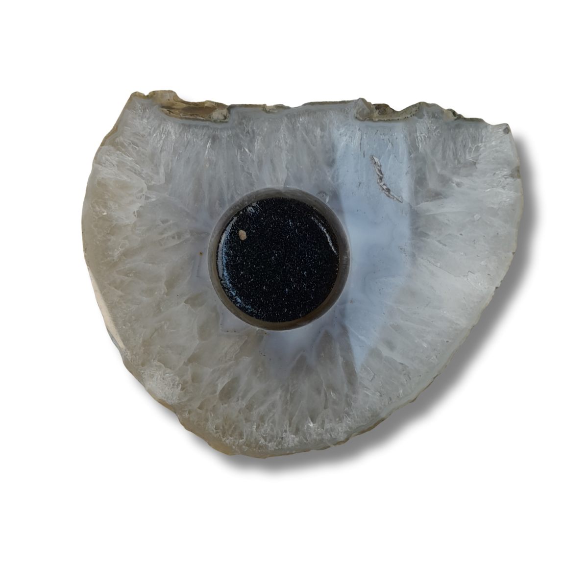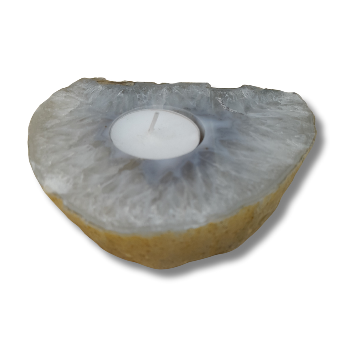 Luxe agaat theelicht met handgeslepen randen en een prachtig glanzend gepolijste kristalstructuur aan de binnenzijde. De diepe uitsparing laat het waxinelichtje mooi verzonken liggen, waardoor het geheel een elegante, rustige uitstraling krijgt.