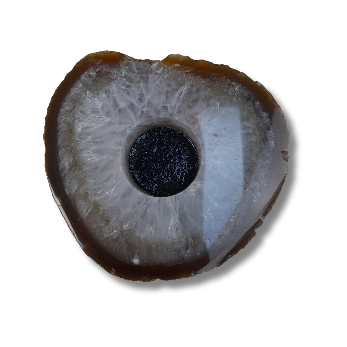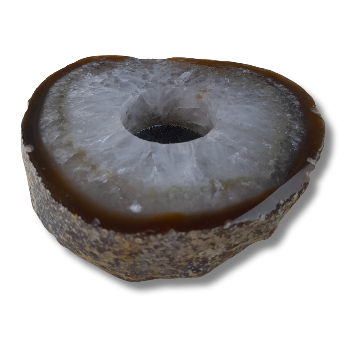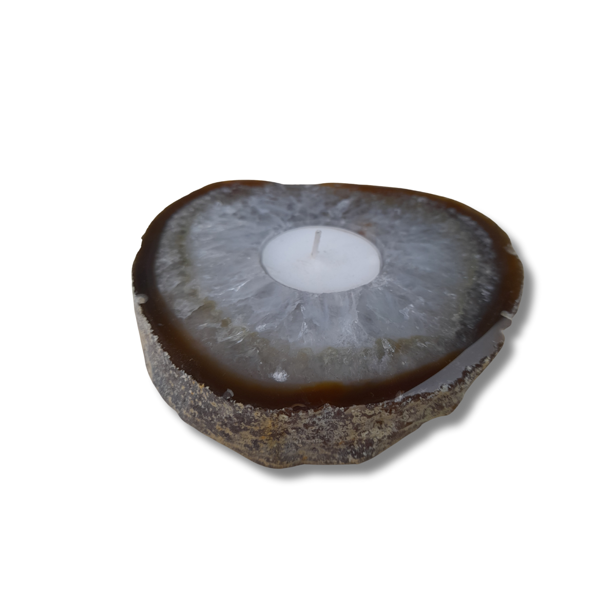 Luxe agaat theelicht met handgeslepen randen en een prachtig glanzend gepolijste kristalstructuur aan de binnenzijde. De diepe uitsparing laat het waxinelichtje mooi verzonken liggen, waardoor het geheel een elegante, rustige uitstraling krijgt.