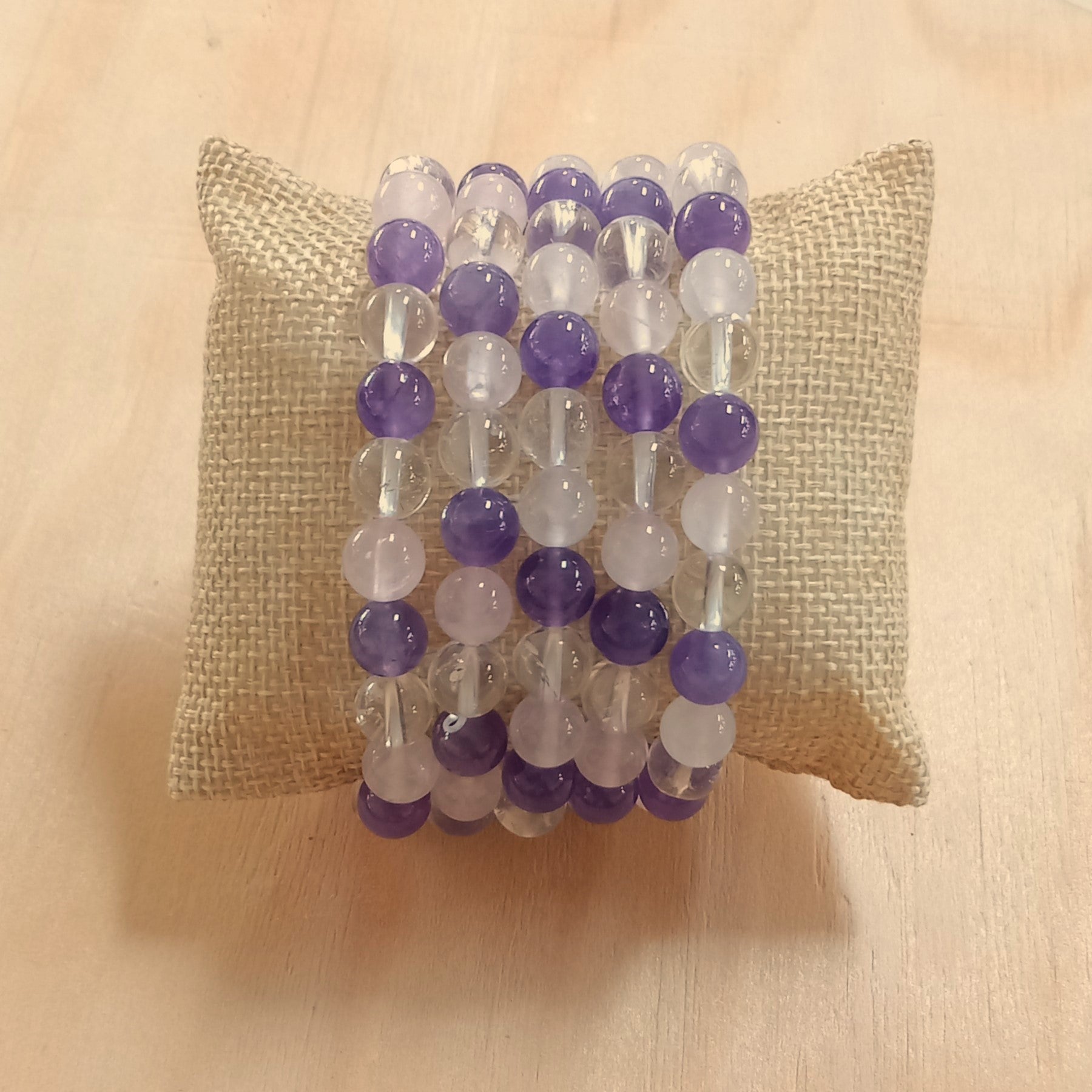 Ronde 8 mm. kralen van hoge kwaliteit amethist, bergkristal en rozenkwarts welke samen de gouden driehoek vormen. Geregen op een... Lees meer